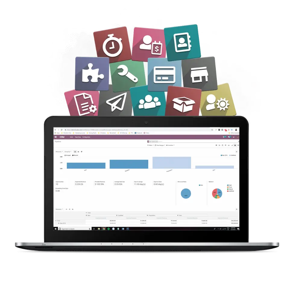 Puede llevar tus Ventas, CRM, Compras, Facturación, Contabilidad, Inventario, Fabricación, Sitio Web, Comercio electrónico, Punto de Ventas, Recursos Humanos, Contratación, Social Marketing y mucho más...