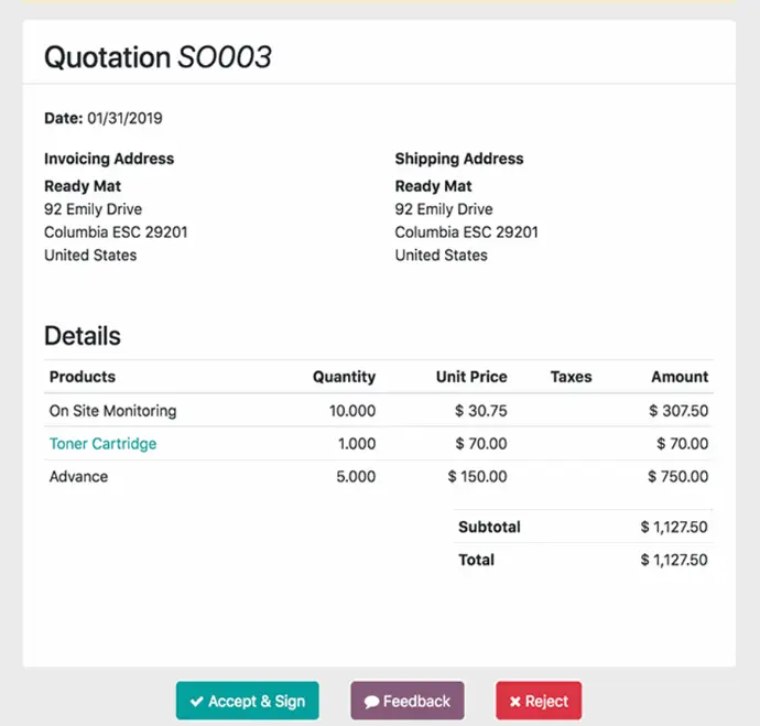 El portal del cliente proporciona a sus clientes acceso a sus presupuestos, pedidos de venta y órdenes de entrega. Ahorre tiempo y utilice Odoo Signature para firmar fácilmente acuerdos de confidencialidad, contratos o cualquier documento PDF.